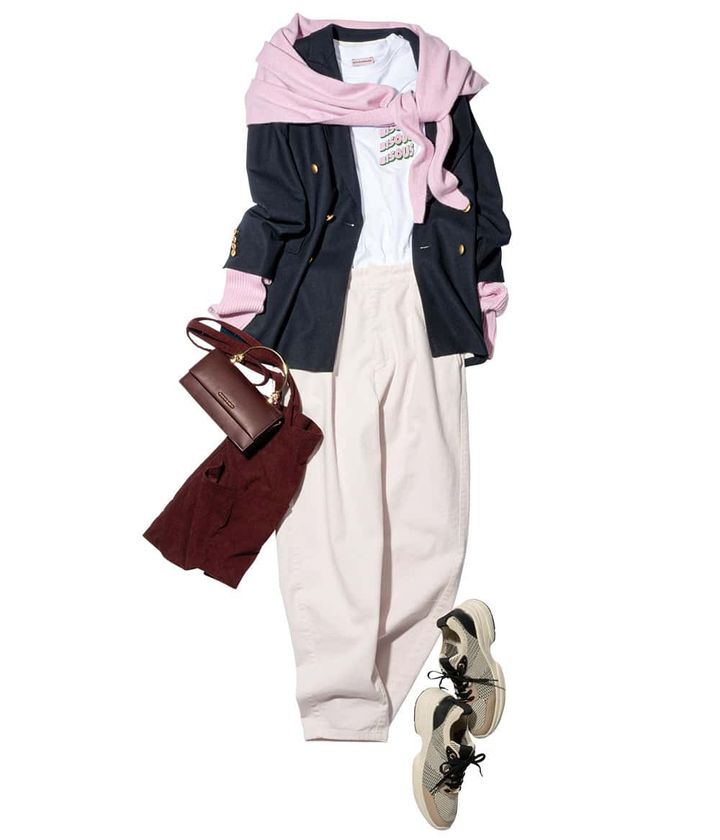 定番ネイビーJKに優しげピンクの差し色で可愛げをプラスして。