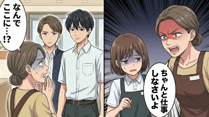なんと、後輩くんと、お局パートさんの息子が並んでこちらの様子をじっと見ていたのです。お局パートさんもそれに気づき、「なんでここにいるの!?」「2人って友だちだったの!?」と完全にパニック状態