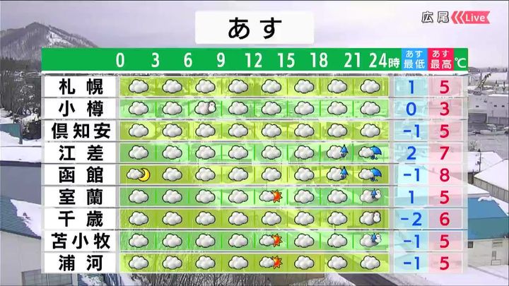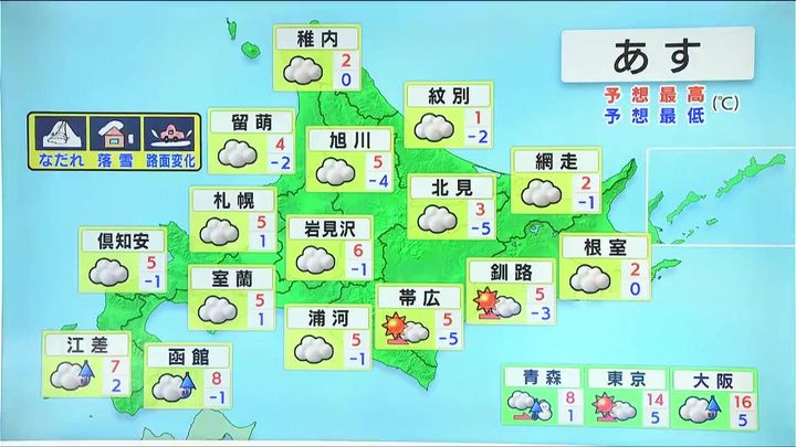 十勝や釧路地方で昼頃まで晴れ間がある他は、広く曇るでしょう。最高気温は各地プラスで広尾は2度です。引き続き、落雪や泥はねに注意が必要です。