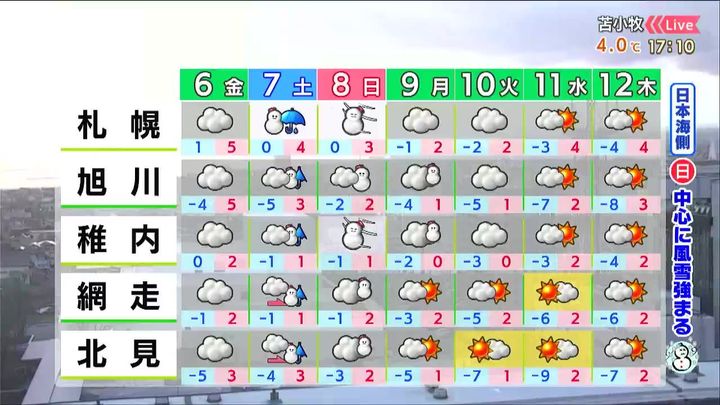 ※5日午後5時時点の情報です。最新の気象情報は、HBCウェザーセンターのホームページなどでご確認ください。HBCは気象庁の認可を2001年に得て以来、民間気象会社の一つとして「HBCの独自予報」を発信しています。