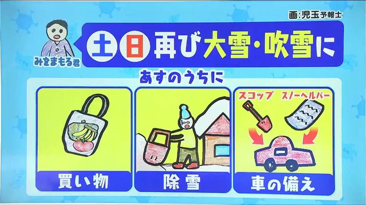 土日は再び大雪や吹雪、一部で荒れた天気になりそうです。あす6日(金)のうちに、食材などの買い物をしておきましょう。大雪になった地域では、除雪作業を進めておきましょう。土日も湿った雪になります。車の立往生に備え、スコップやスノーヘルパーを積んでおきましょう。