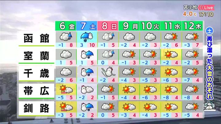 土曜は胆振の山沿いや十勝南部で再び30センチ前後の大雪になるおそれがあります。日曜は風が強く、千歳周辺でふぶくでしょう。来週は晴れても気温の上がり方が鈍くなります。