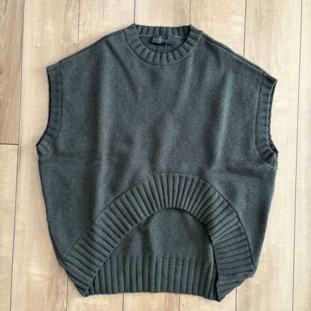 端境期に選ぶなら、デザインにひとクセある1枚が便利。ZARAのアシンメトリーヘムのニットベストは、裾の斜めラインが自然と視線を流し、気になるお腹やウエスト周りをすっきり見せてくれます。
