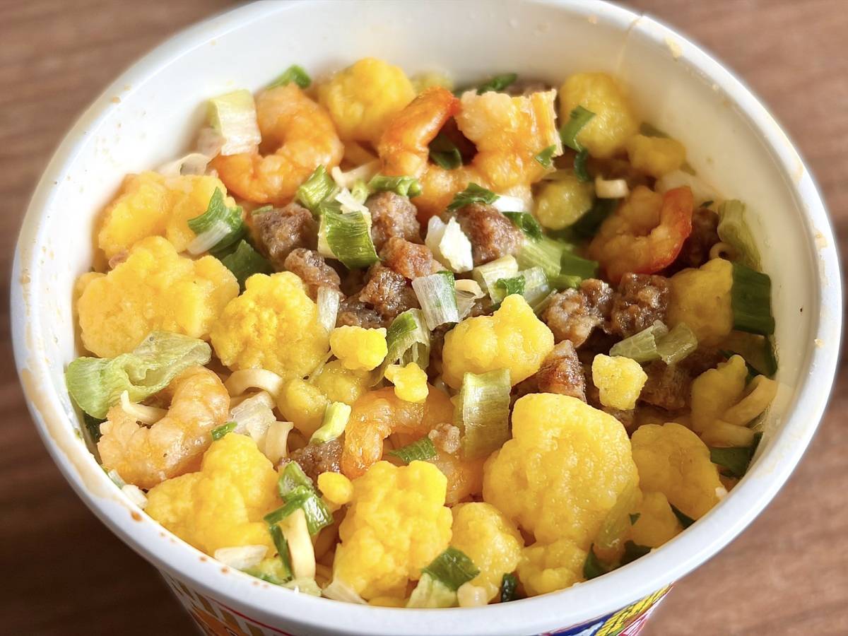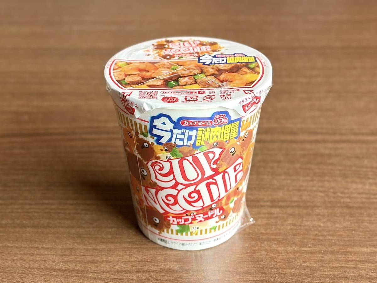 今回購入したのは、いつものカップヌードルの「謎肉」が約55%増量した一品。