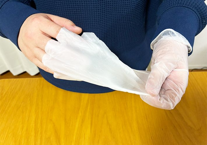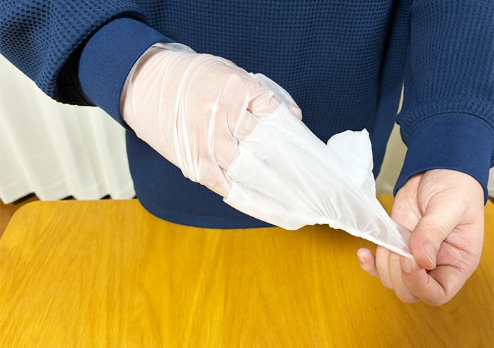 なお、このやり方は手袋の素材によっては、うまく重ねてはめられなかったり、破れてしまったりする可能性があります。ゴム手袋などではなく、表面がサラサラしたビニール素材のものがよいかもしれません。