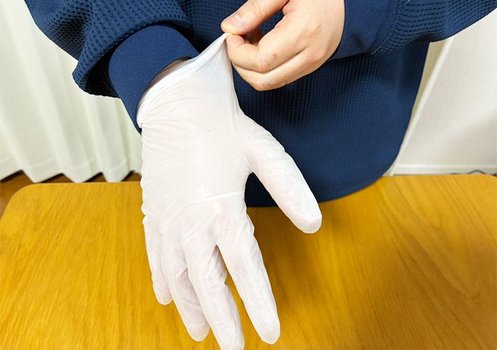 手袋の着脱時は手首の部分を持つようにすると、汚れた面に触れずに済みます。