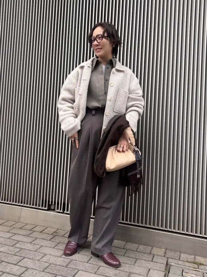 ブラウンのトーンオントーンが大人ムードな着こなし。気負わないラフさが漂いながらも、どこかきちんとした印象に見えるのはローファーと眼鏡の存在感が大きい。ローファーの光沢感がコーデ全体をグンと上品に見せてくれる。