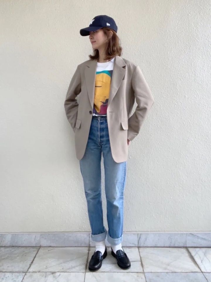 デニム×Tシャツのカジュアルルックをオーバーサイズのテーラードジャケットで程よくキレイめスタイルにシフト。足元はあえてスニーカーにせずローファーにすることで適度なキリリ感とヌケ感を演出するのがこなれるためのポイント。