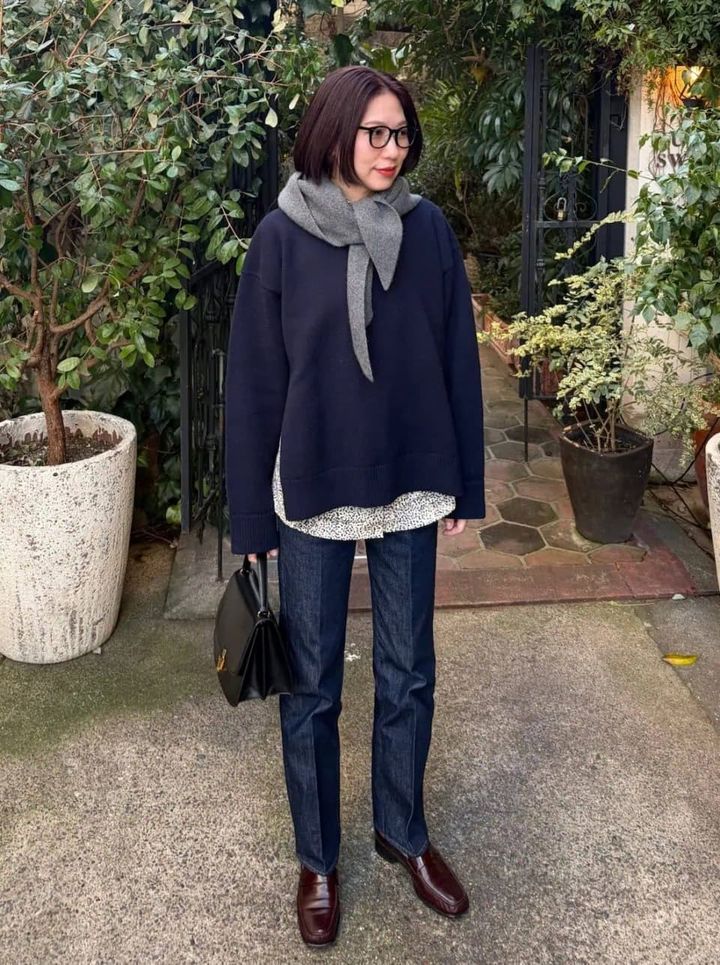 インディゴデニムとニットのネイビートーンにツヤのあるブラウンローファーが上品な大人のカジュアルトラッド。シンプルな着こなしを洒落たムードに昇華する、旬の三角ストールと眼鏡、レイヤードはぜひお手本にしたい。