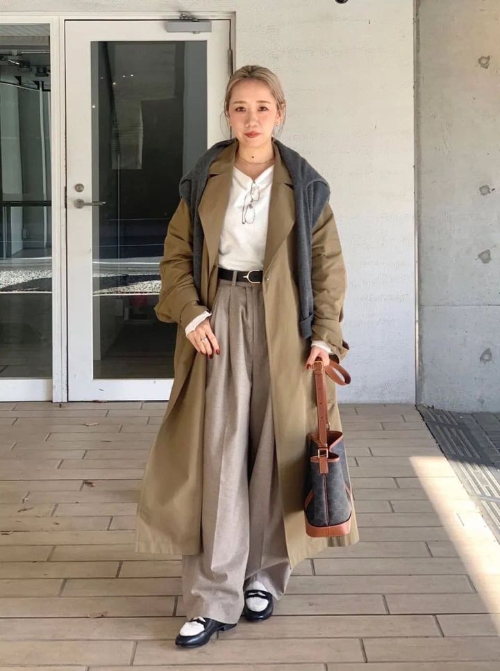 シューズ¥42,900(カステラーノ)、トレンチコート¥64,900、トップス¥13,200、肩にかけたニット¥25,300、パンツ¥35,200(全てコンテ/全てconte 青山店)、CELINEのバッグ、その他は全て本人私物