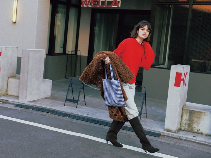 スウェット+デニムでも迫力が得られる鮮烈な赤のパワー。デニムをブーツインして適度な緊張感を補えば、リラックスとは一線を画する装いに。パールとリュクスなボアコートでさらにクラスアップ。 ネックレス/モニス(フォーティーン ショールーム)