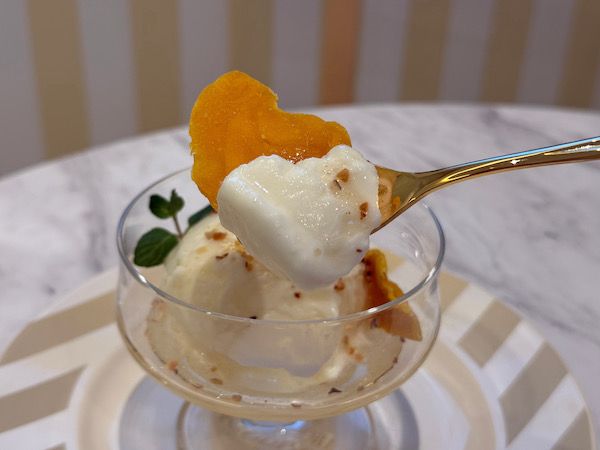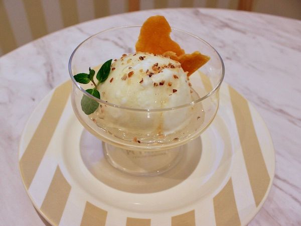 運ばれてきた途端、白トリュフの芳醇な香りがふわりと漂います。ねっとりと濃厚でコクのあるはちみつが、ひんやりとしたジェラートに溶け合い、口の中でゆっくりと広がりました。上品な甘さと香りが特徴の、贅沢な一品です。