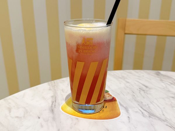提供時に、「飲む前に、かき混ぜてくださいね。」とスタッフの方から案内がありました。かき混ぜるといちごのカラーが広がり、シュワっと音も聞こえます。ドリンクはテイクアウトもできますよ。 イートインの際は、「ポシェ」プリンのコースターで提供されるので、ぜひ見てみてくださいね。