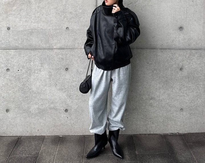 ボトムにはあえてラフなグレーのスウェットパンツを合わせることで、レザーのハードさを中和し、大人の余裕を感じさせるミックススタイルに。足元はポインテッドトゥの黒ブーツを投入して、スポーティなボトムを都会的な印象へと引き上げています。小ぶりのバッグやサングラスなど、小物使いにもこだわりが光る装いです。シルエットのコントラストを活かした、旬のバランスが完成します。
