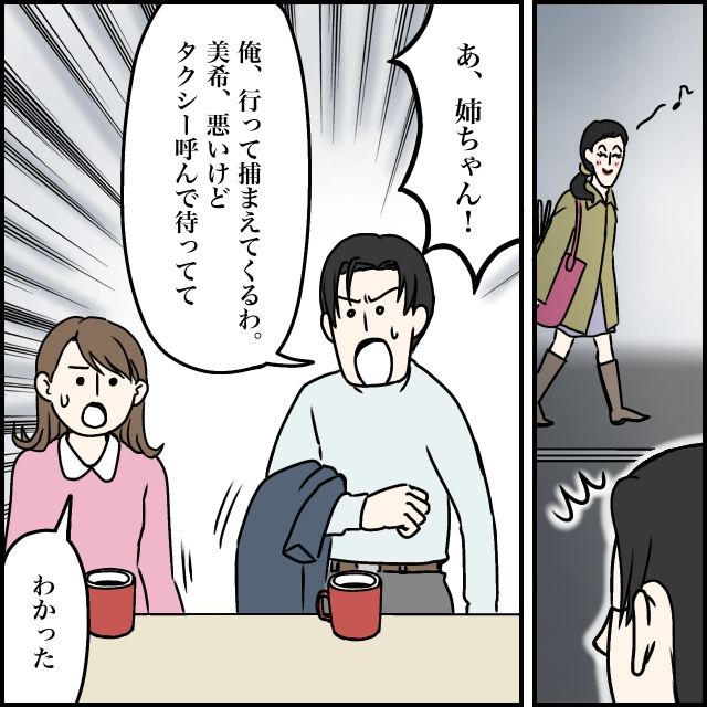 すると道路の向こうから、上機嫌で歩いてくる玲美さんの姿が目に入りました。それを見つけた太一は、「あ、姉ちゃん!」と勢いよく立ち上がり、「行って捕まえてくるわ、美希、悪いけどタクシー呼んで待ってて」と言って足早に玲美さんのもとに向かいました。