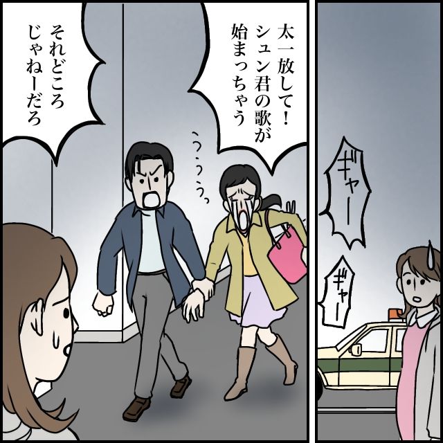 ほどなくして、太一は玲美さんを捕獲。玲美さんはよほどライブに行きたかったのか、「太一放して!シュンくんの歌が始まっちゃう」と必死に泣き叫びます。しかし、太一がそれ聞き入れるはずもなく、玲美さんはそのまま引きずられるようにしてこちらへ連れてこられました。