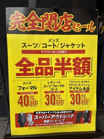 【閉店】3/29まで、紳士服コナカ三鷹店で「最大半額」の閉店セール開催中