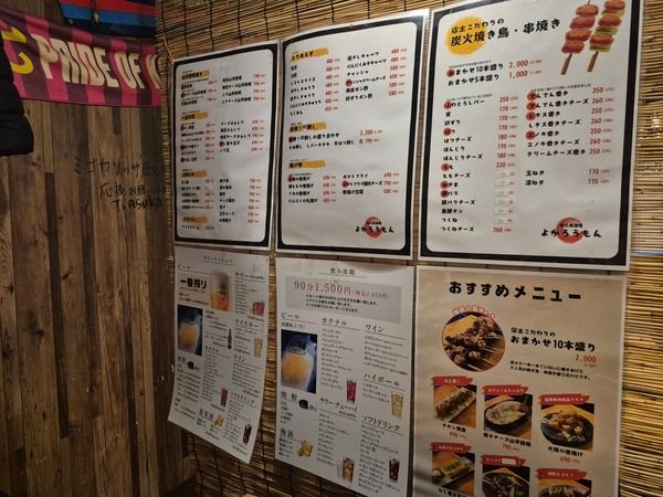 メニューは御簾と壁に掲載されてあります。人気メニューはやはり、店長こだわりの炭火焼き鳥・串焼きです。