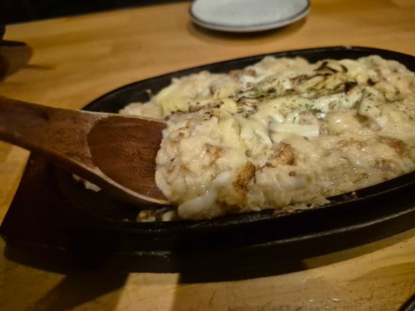 鉄板の上でぱちぱちと音を立てながら登場!チーズの芳ばしい香りに、食欲がそそられること間違いなし。
