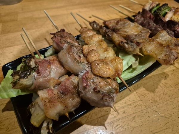 炭火で一本一本丁寧に焼き上げられた焼き鳥盛り合わせはボリュームがあり、肉串だけでなく野菜串も色々入っているのがうれしいポイント。