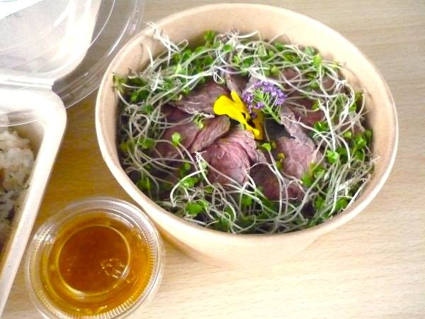 ローストビーフ丼は、ソースをかけて食べます。お肉が柔らかくて、噛みしめて旨みいっぱいでした。食べられるお花(食用花)のトッピングが、可愛いですね。