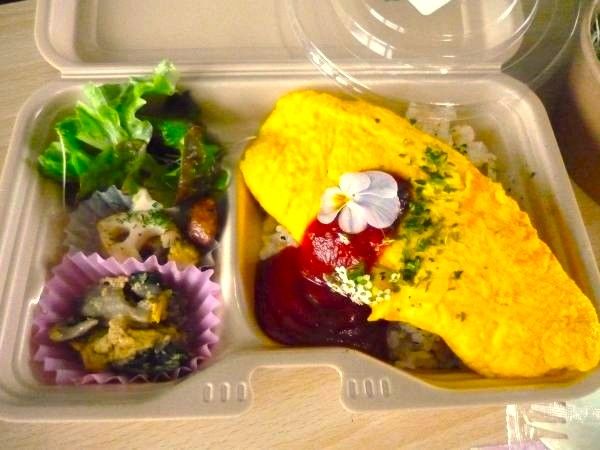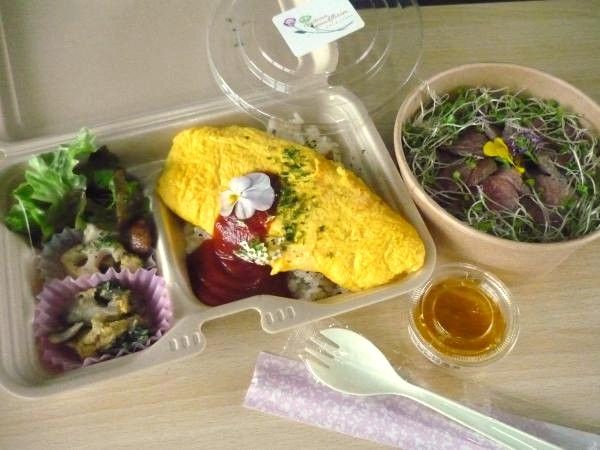 食べられるお花(食用花)を使っていて、華やかで可愛い~。これ食べたら女子力上がっちゃいそうです。たまごがふわとろアツアツで美味しかった~。ライスはガーリックライスで、食欲そそる香りです。お野菜の食感とお味をしっかりと感じる付け合わせで、体に優しいな~って思いました。