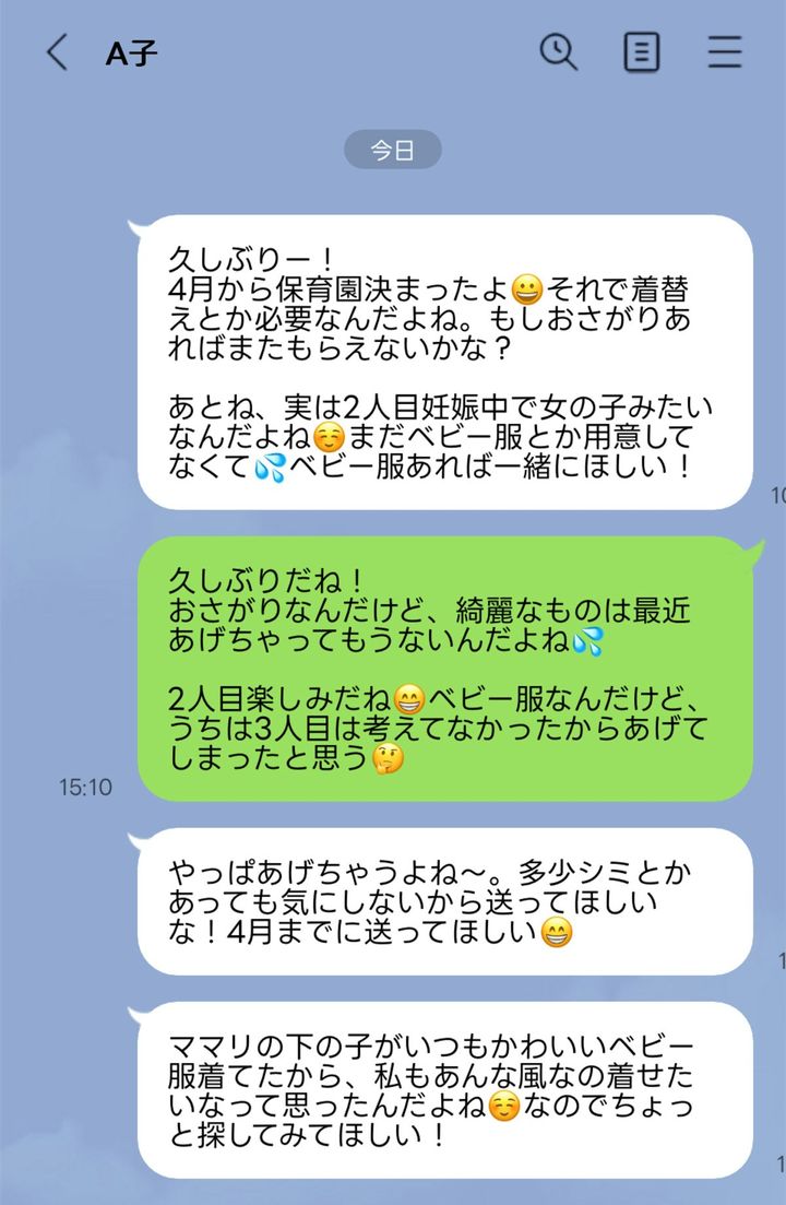 大学時代の友だちから、「子ども服のおさがりを送ってほしい」と言われたという、投稿者さん。