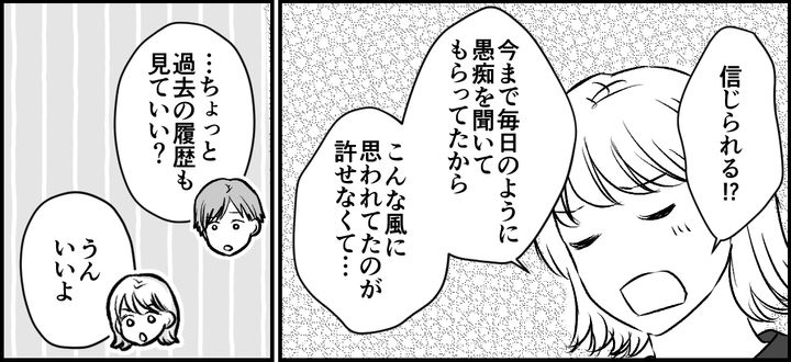 オサムは、私とナルミのやりとりのトーク履歴を、最初の方から見ていきました。そして、私の愚痴の多さにオサムは驚きました。オサムはため息をついて……「こんなに愚痴ったら相手は戸惑うし、嫌にもなるよ」というのです。