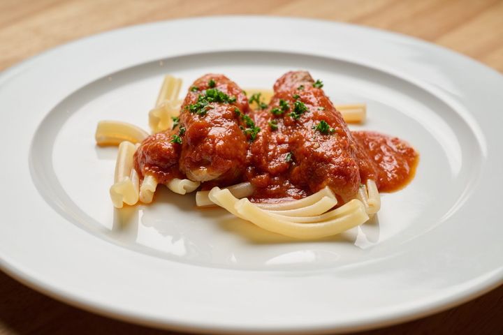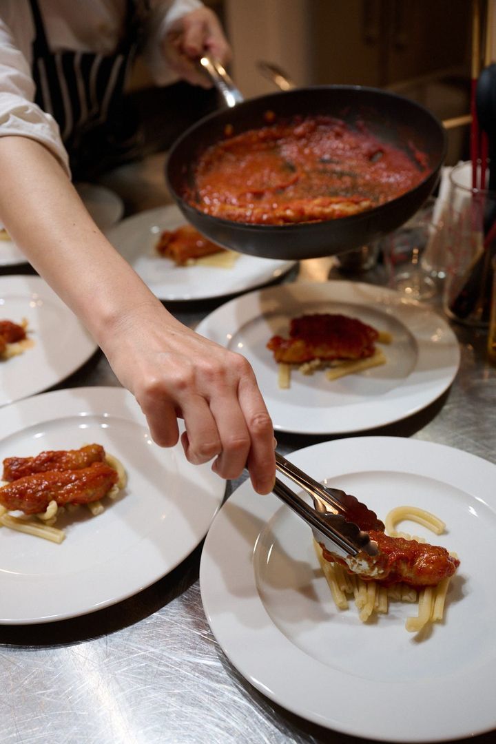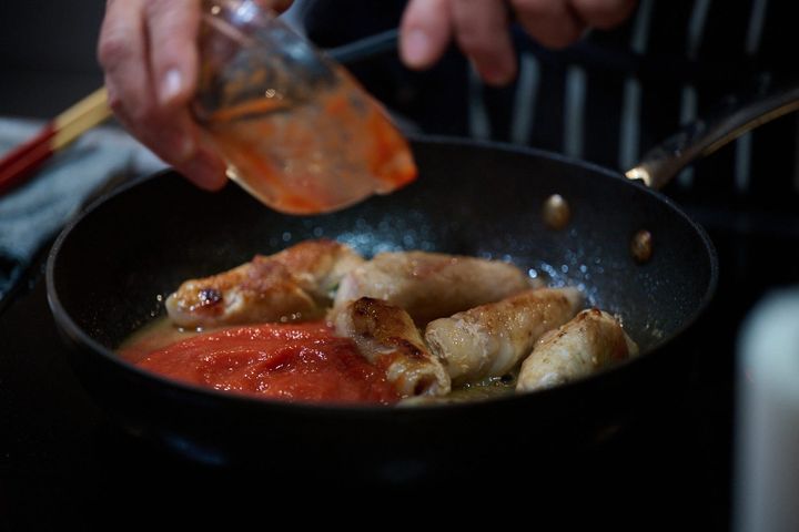 「サルティンボッカは、まず豚の肩ロース肉の巻き終わりを押さえて焼き固めていただくのがポイントです。固まったらひっくり返しても剥がれにくくなります。裏表をこんがり焼き、白ワインを入れてしっかり煮詰めます。ワインを入れたら鍋を覗き込まないで!相当のアルコールが上がってきてむせますから気をつけてください。それからトマトを入れて火にかけます。トマト缶を使うと濃厚な味わい、フレッシュトマトなら爽やかな味わいに。湧いてきたら弱めの中火、5分くらいしたら適当に煮詰めて味を調えてお終いです。お好みのパスタと合わせても、残ったソースにご飯とチーズ入れてリゾット風にしてもおいしくいただけます」