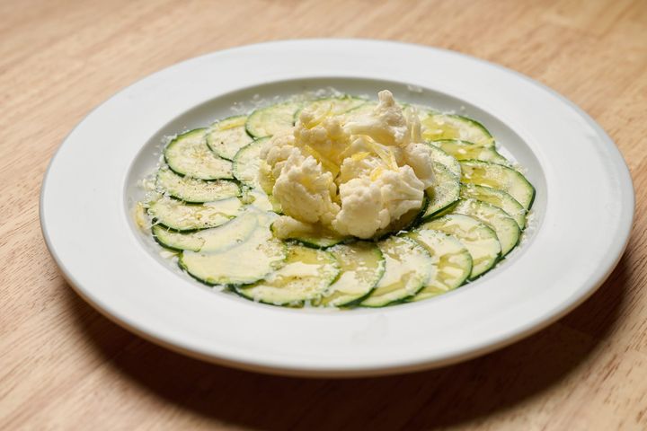 レッスンは昼の部と夜の部の2回。 アトリエのドアを開けると、キッチンで準備を進める上田さんとアシスタントの皆さまの姿がありました。一皿目は、ズッキーニのカルパッチョです。
