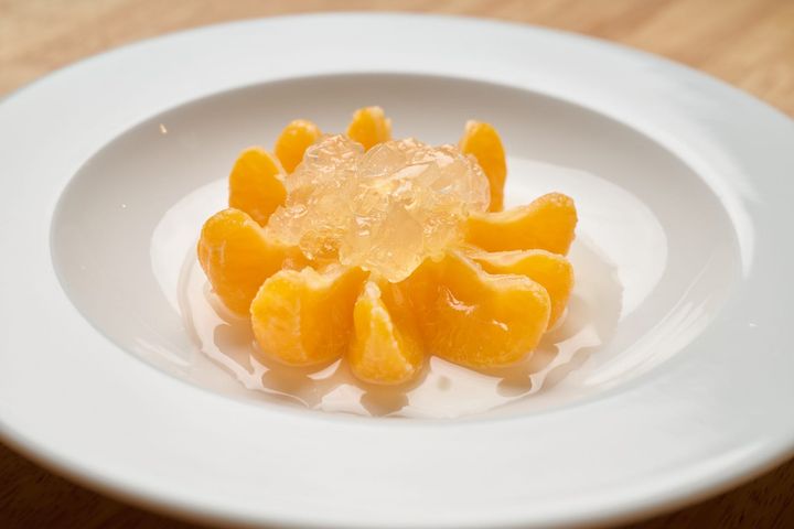 「最後に、みかんのコンポートをお楽しみください。みかんの実にシロップがほどよくしみ込んで、いつも普通に食べているのとは違う味に仕上がっていると思います。コンポートを作るのに、この調理器はとても便利かなと思いました。それから、ご飯も普通に炊けます。お米を研いで分量のお水を入れてレンジにかけ、熱くなったらそのまま置いておけばご飯が炊けるという感じなんです。炊飯器があるからそんなのはと思いますが、火口が足りないときこれでもご飯が炊けると思っていただくとよいと思います。あとは汁物、スープ、味噌汁の具を入れてある程度温まったけれど具のにんじんがまだ硬いといった状態でポンとレンジに入れていただくとこの中で具がしっかりと軟らかくなります。カレーにも向いているかもしれませんね。付属のレシピブックを見て試行錯誤していただくと楽しいかもしれません」