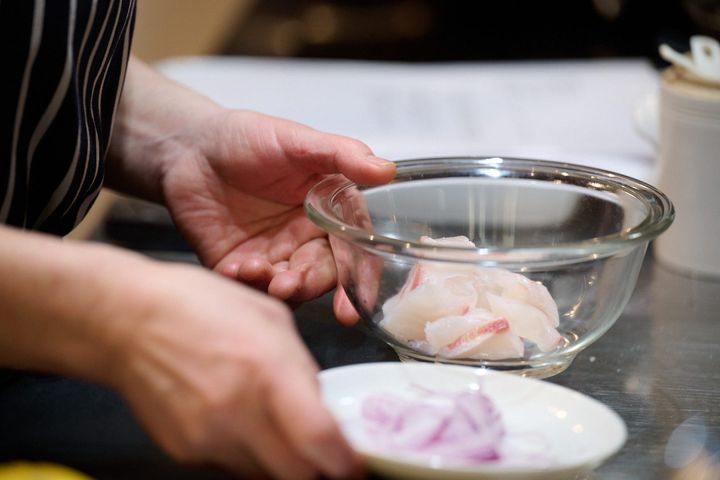 「セビッチェに使うお魚は、ライムの酸味もしくはレモンの酸味がとても合うものであれば、ゆでたたこ、鯛でもいいですし、赤身ならサーモンをおすすめします。まぐろは柑橘の酸がつくと中が赤くて表面が真っ白となって残念な感じになるのでおすすめしません。ポイントは必ず塩をして味を締め、なおかつ余分な塩をちょっと洗い流すこと。洗い流すのはもったいないと思われるかもしれませんし、それはご法度で拭くだけっていうレシピもいっぱいありますが、いつ誰がどう切ったかわからない魚だから洗ってもいいと思うんです。私たちだって汗だくで帰ってきたらシャワー浴びたいですよね。魚の切り身、今日は例えば鰆の切り身をバター焼きにしたい、鯛の切り身をアクアパッツァにしたいなというときも、少しの多めの塩をすり込んでしばらく置き、さっとゆすいでから作っていただくと、あのもわっとした魚臭さがなくなるので、ぜひやってみていただけたらと思います」