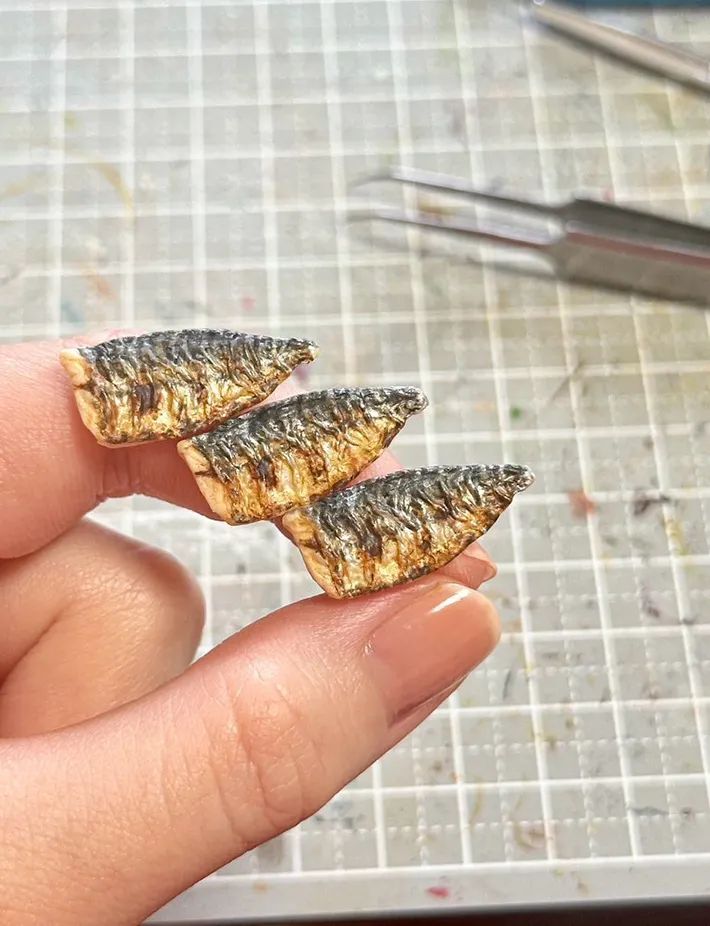 『焼き鯖』のミニチュアを作ったところ、サイズや形がまるで人工のつけ爪であるネイルチップのようになってしまったとか。こちらをご覧ください。
