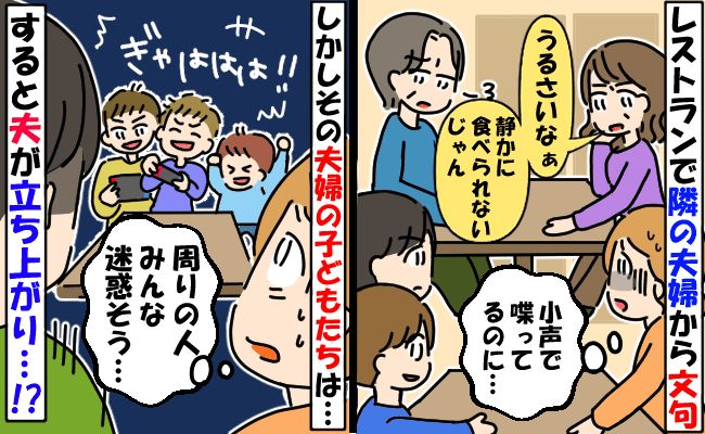 3. 小声で喋る娘たちに隣のママが「うるさい!」は?ママの子どもは大声でゲーム…すると夫が立ち上がり!?