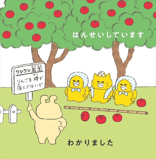 ぐんだんらしい展開も待ち受けています。あるページに登場するのは、木になっているりんごを棒でつついて落とすノラネコたち。順調にりんごを落とすのですが、そのうちのひとつが仲間の頭のうえに落ち、ケガをさせてしまいました。ノラネコは「ごめんなさい」「おだいじに」とお詫びをします。するとそこへ、ワンワン農場のワンワンちゃんがやってきて!?