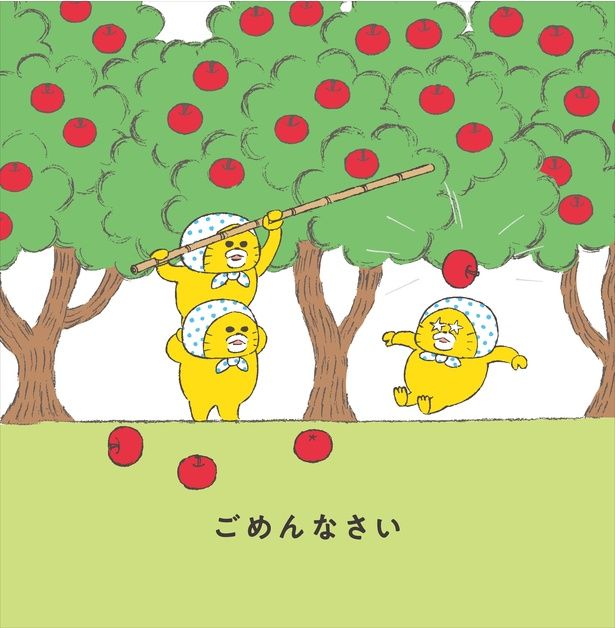 ノラネコたちは正座になり、りんごを棒で落としたことを「はんせいしています」と謝ります。「まったく、いつもどおりの食いしんぼうなんだから…」と、親子で笑いながらツッコみたくなるシーンですね。