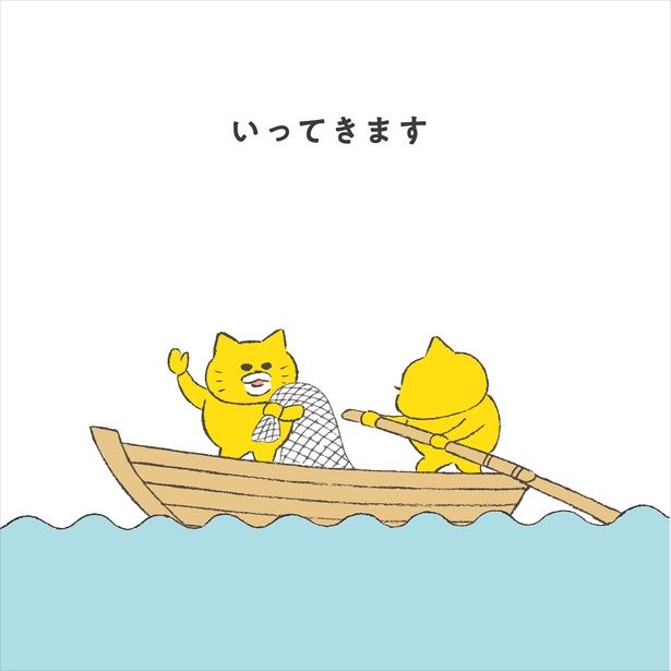 序盤に描かれているのは、ノラネコたちが「いってきます」とあいさつをしながら、船を漕いで漁に出かける場面。隣のページには、「いってらっしゃい」と、ノラネコたちを笑顔で送り出すマーミーちゃんとパッポヒの姿が。さらに次の見開きでは、大量の魚を抱えて「ただいま」と帰ってきたノラネコと、「おかえりなさい」とお迎えするマーミーちゃんたちが描かれていました。