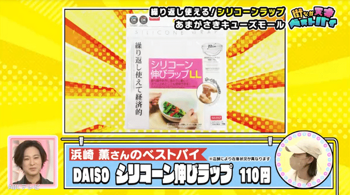 天才ピアニストが最初にインタビューしたのは、同じマンションで暮らしている母娘。娘のベストバイは、節約になるダイソーのシリコーン伸びラップです。何度でも使用できる優れモノで、ラップとしてだけでなく、瓶の蓋開けや、まな板の下敷きといった滑り止めなど、さまざまな用途で大活躍します。