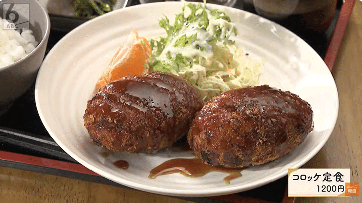看板メニューは、にぎりこぶしほどの大きさがある手作りコロッケ。しっとりとまろやかな味わいの秘密はジャガイモにサツマイモを少し加えること。さらに「企業秘密」という、さまざまな工夫が凝らされているそうです。