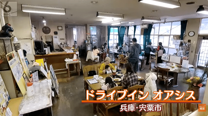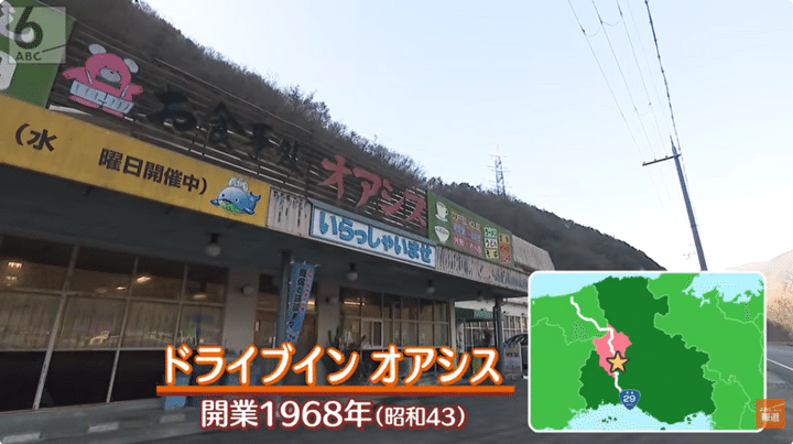 兵庫県宍粟市は、面積の9割が森林という自然豊かな山あいの町。姫路と鳥取を結ぶ国道29号を進むと、ちょっとレトロな看板が現れます。それが「ドライブイン オアシス」。オープンはおよそ60年前。令和の今もここだけは昭和のままのレトロな雰囲気が漂っています。
