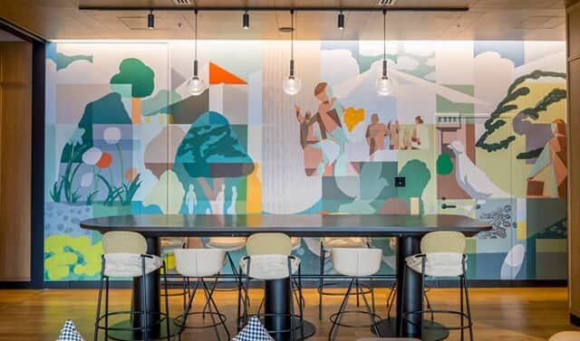 一面が窓、一面にアートが描かれたラウンジには、オリジナルデザインのソファや椅子を配置。様々な色や形の椅子は寛いだり、ドリンクやフードを楽しんだりと、使い方に合わせた形で、座り心地を全て確かめてみたくなる誘惑にかられます。