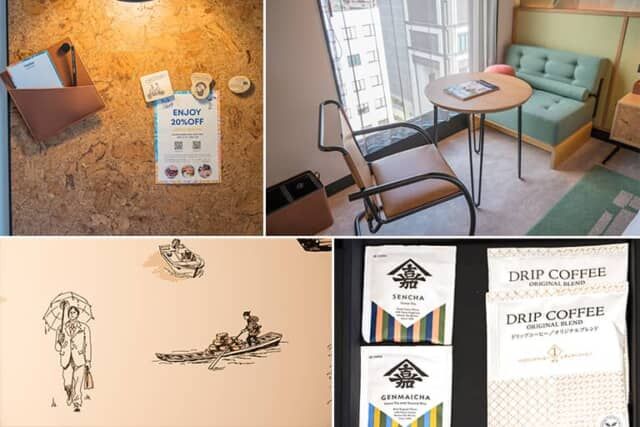 オリジナルデザインの椅子やソファもミッドセンチュリーのエッセンスを採り入れたデザイン。窓辺からは都会の風景が見渡せます。江戸の物流を支えた日本橋川の渡しや、日本の経済を支えた営業マンなど、街のストーリーが読み取れるイラストも楽しめます。お茶のティーバッグは日本橋の老舗「山本山」の煎茶と玄米茶です。