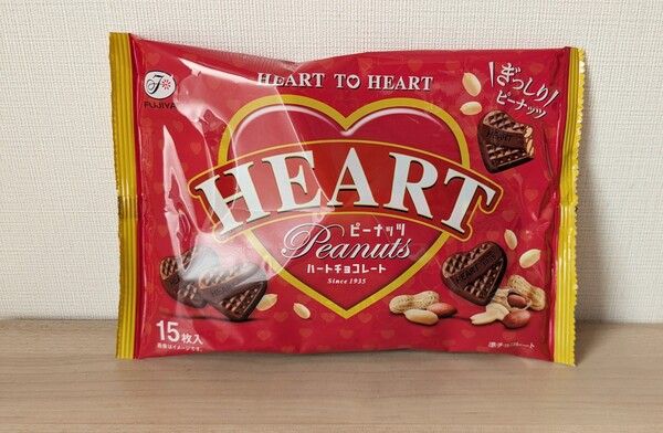 ほどよい甘味とコクのあるクリーミーなハート型のかわいい準チョコレート。便利な個包装。15枚入りのお得なピーナッツチョコレートとなっています。