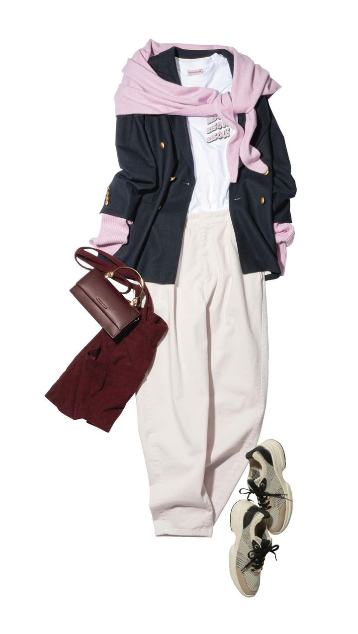 春コーデ定番の桜カラーをパンツで挑戦。淡い色味のピンクなら、コーデが大人らしく仕上がり、子ども見えを回避できます。カーヴィーパンツは、女性ラインのいいとこ取りをできるのがポイント。仕上げにジャケットを羽織って、パキッと引き締めます。