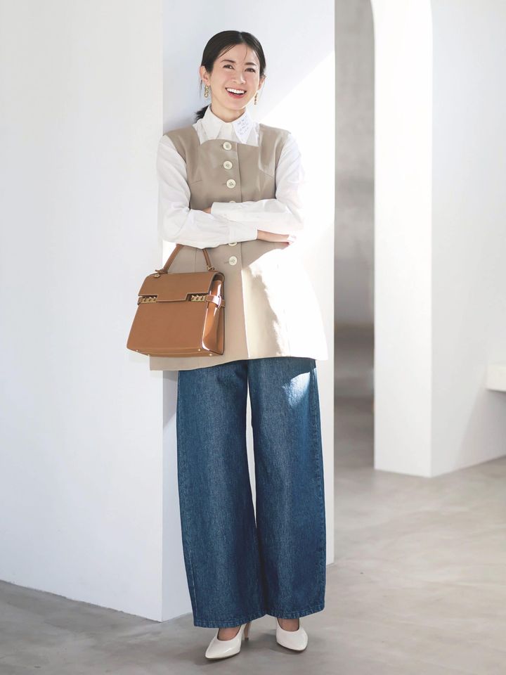 デニムパンツ¥39,600(デパリエ/デパリエ 伊勢丹新宿店)ジレ¥37,000(シーニュ)シャツ¥56,100(マディソンブルー)バッグ¥1,101,100(デルヴォー)パンプス¥137,500(ジャンヴィト ロッシ/ロンハーマン)片耳ピアス各¥32,890(ビジュードエム/ビジュードエム六本木ヒルズ)