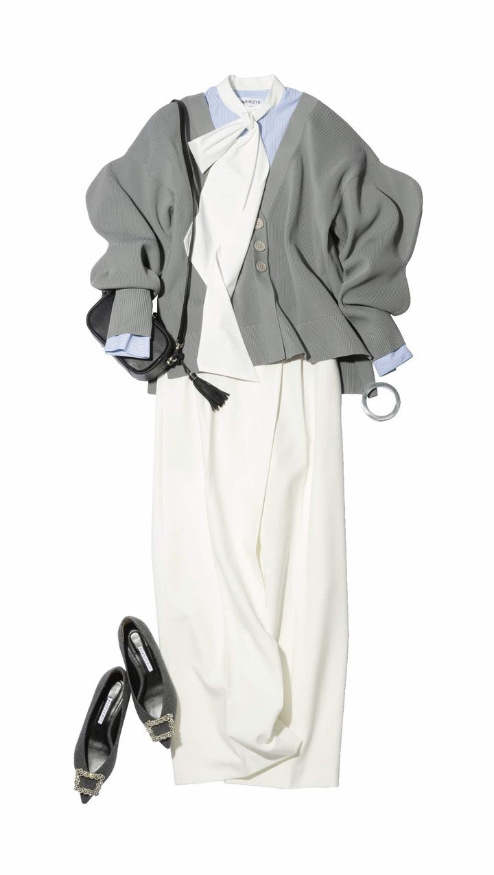 カーディガン¥15,400ボウタイシャツ¥19,800(ともにHeRIN.CYE)パンツ¥12,000(PLST)バッグ¥49,500(土屋鞄/土屋鞄製造所)パンプス¥46,200(ピッピシック/ベイジュ)ブレスレット¥43,200(アビステ)