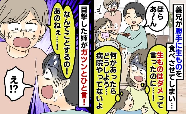 まだ生ものを食べさせたことがないことも義兄に伝えたはずなのに、なぜ? という気持ちでいっぱいになり、ひと言物申したいと思ったそのとき! 先に声を荒げたのは、まさかの姉でした。「なんてことするの! 生ものはまだ食べたことがないって聞いてなかった!? アレルギーが出たらどうするの!?」と、すごい勢いで私が伝えたかったことを全部義兄に言ってくれたのです。