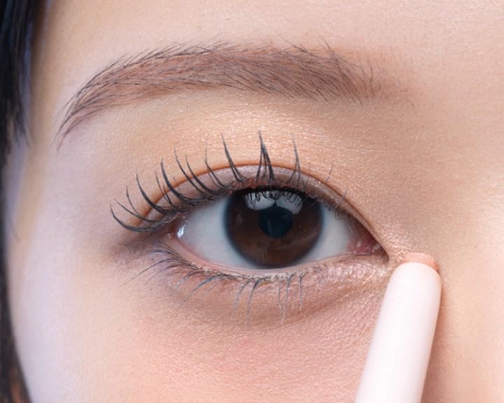 目頭と上まぶたの中央の2ヵ所に、グリッターを足すと目元がパッと明るくなる!目頭はくの字を描くようにし、上まぶたは二重線より上の位置にサッとひと塗りして。