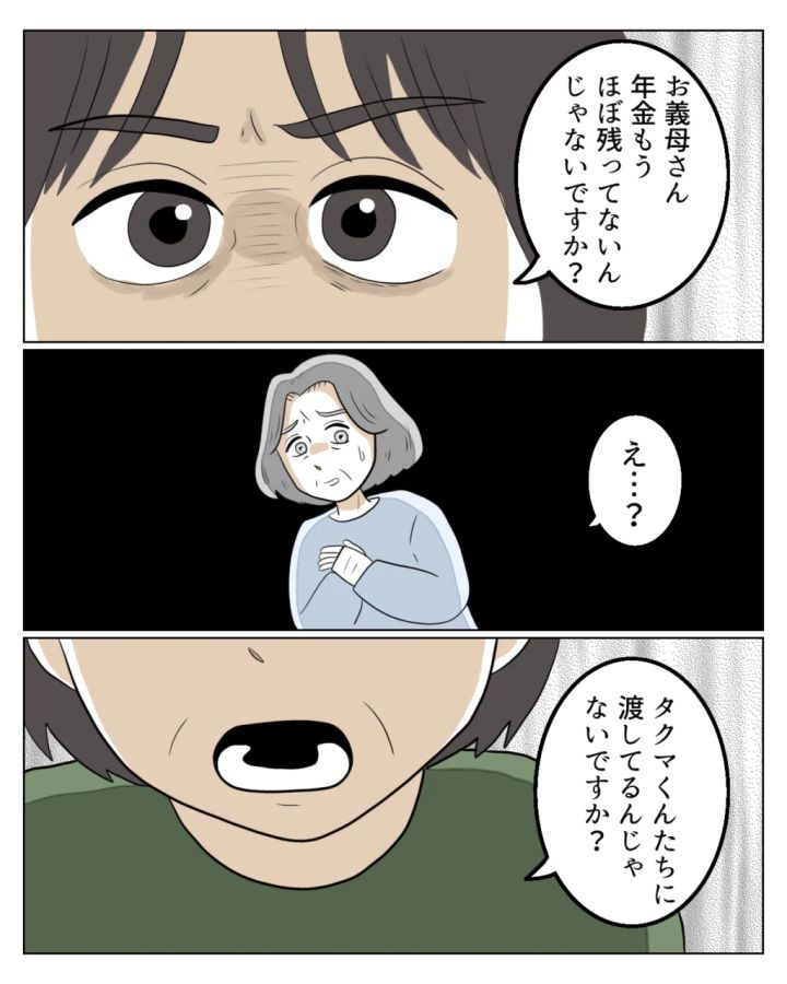私は義母にジロリと視線を向けると、「お義母さん、年金もうほとんど残っていないんじゃないですか?タクマくんたちに渡しているんじゃないですか?」と問いかけました。義母は図星を突かれたのか、「え・・・?」とぎくりとした表情を浮かべます。