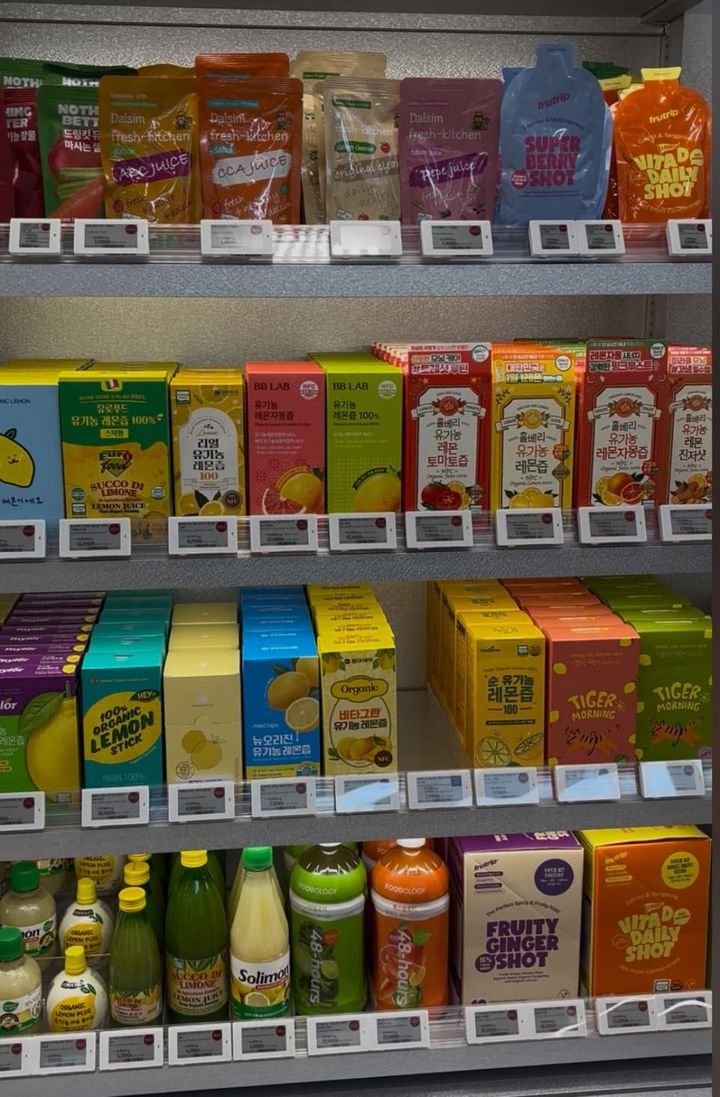 オリーブベターで特に目立っていたのが、オーガニックのレモンエキス。2階には、大きな棚でいろいろなメーカーの商品がずらりと並んでいました。今回は、ALL THE BETTERのものを購入(7本入り。₩6,900で1+1のセール中でした)してみました。普段から朝起きぬけに白湯にレモンエキスとはちみつを入れて一緒に飲んでいるのですが、疲れにくくなった気がしていて、続けている習慣でもあります。